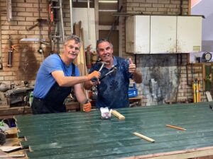 Dat de kinderboerderij nu zulke mooie nieuwe deuren heeft, hebben we voor een belangrijk deel te danken aan de inzet van aannemer Joop Jansen uit Elst (rechts op de foto). Hij had zijn werkplaats belangeloos ter beschikking gesteld, zodat het klusteam daar de deuren kon gaan maken. Namens de Landerij onze hartelijk dank, Joop!