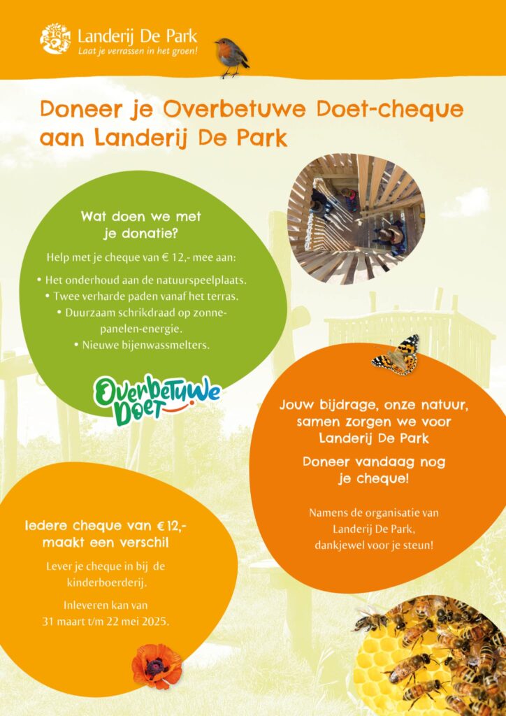 Overbetuwe Doet gaat weer van start! We gaan sparen voor onderhoud van de natuurspeelplaats, twee verharde paden vanaf het terras, schrikdraad op zonnepanelen en nieuwe bijenwassmelters. Alles bij elkaar een heleboel, maar dit jaar is er ook maar één ronde. En elke cheque is nu € 12 waard! Woon je in Overbetuwe, dan valt binnenkort de bekende cheque bij je in de bus. Weet je nog hoe het werkt? Ga naar overbetuwedoet.nl, kijk bij ‘initiatieven’ onder ‘Landerij’, kies ‘doneren’ en vul de activatiecode van je cheque in. Of mail die code (of foto van je cheque) naar landerijdepark.pr@gmail.com en dan zorgen wij voor de rest. Je kunt je cheque (en misschien ook wel die van je buren of zelfs van de hele straat!) ook inleveren bij de kinderboerderij. Let op: de codes zijn maar geldig tot 22 mei. Grijp je kans om in deze ene ronde zoveel mogelijk cheques te verzamelen!