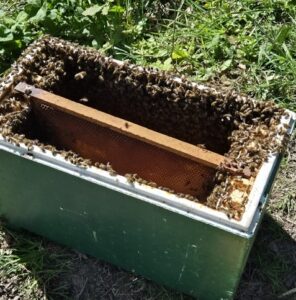 Tijdens “imker bij de stal” in april zagen wij dat het bijenvolk in de warrékast (met de doorkijkraampjes) ging zwermen. Het was een drukte van jewelste voor de kast. Als snel hing de zwerm aan een tak vlakbij de bijenstal. We hebben de zwerm makkelijk kunnen scheppen. De bijen in de zwerm zullen niet snel steken, ze hebben immers geen kast om te beschermen. Voorzichtig vegen we de bijen in een bak, als de koningin in de bak zit gaan de werkbijen “stertselen”. Dat is een soort “twerken”, bijen dansen met hun achterkant om de andere bijen te vertellen dat daar de koningin is. Na enige tijd zitten alle bijen in de bak. We kunnen nu de bijen in een bijenkast doen. Zo hebben we weer een extra bijenvolk.