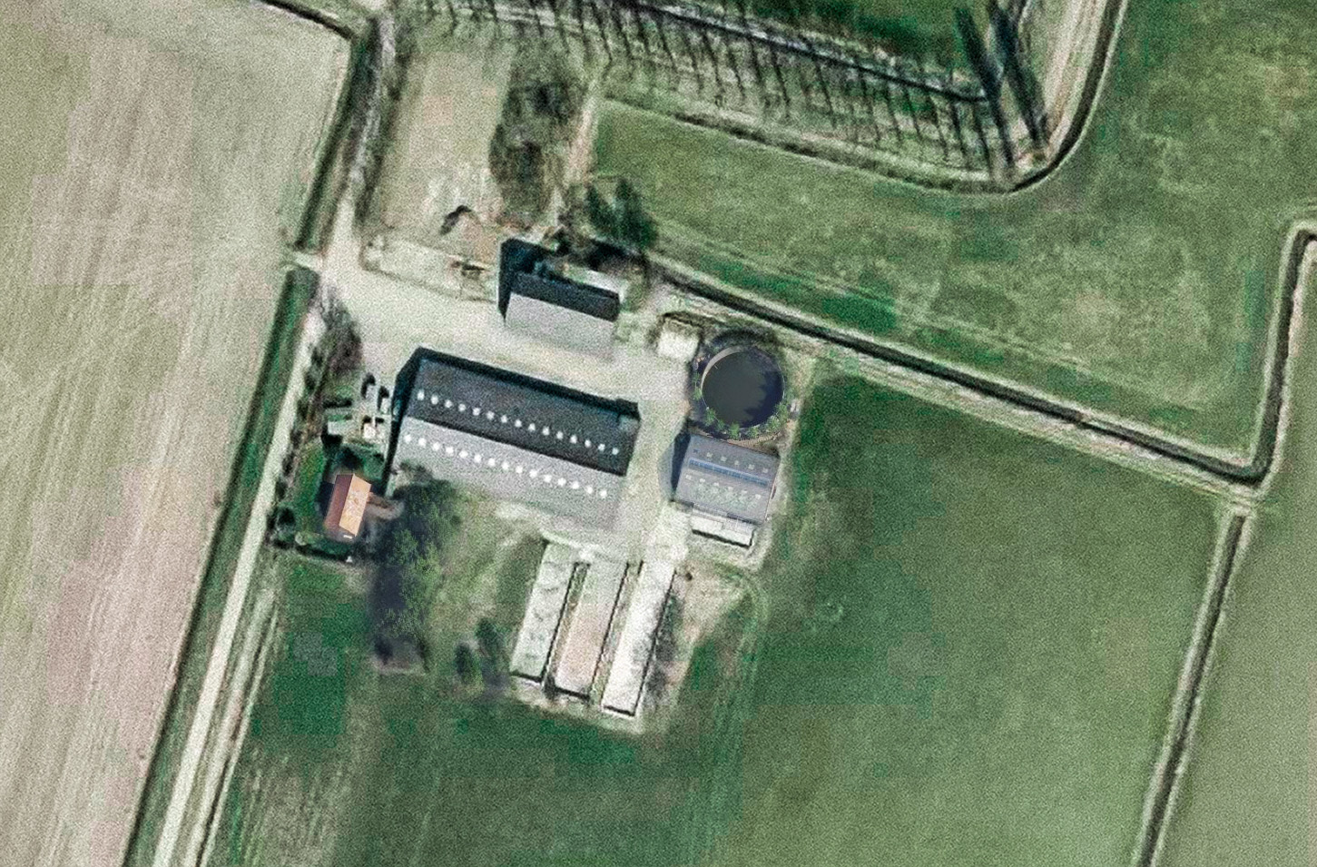 Een oude luchtfoto van Landerij De Park. De drie mestopslagsleuven (onderin de foto) zijn nu de tuinen van LDP. Het huis waar de boer woonde is nu het kantoor van de parkorganisatie Lingezegen. De twee muren van de grote koeienstal staan er nog.