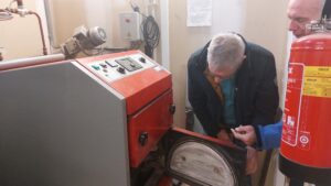 Vlak buiten de ingang van Droom staat een industriële stofzuiger. De slang loopt een openstaande deur in. Ik kijk om het hoekje en zie twee mannen van het klusteam in de weer bij de kachel. Die wordt via een spindel ‘gevoed’ met pellets uit de silo die buiten aan de gevel hangt. Dat geeft een comfortabele warmte in het restaurant en de andere ruimtes. Twee maal per jaar moet de vuurhaard grondig worden gereinigd en elke twee weken is de asla aan de beurt om geleegd te worden. Uurtje werk en de vloerverwarming kan weer zijn weldadige werk doen.
