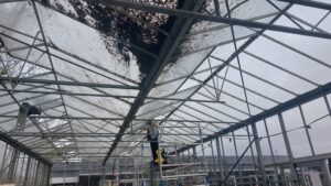 De kas is vrijwel leeg. Plannen voor een nieuw plantseizoen zijn natuurlijk al gereed, maar vullen de borders nog niet. Op een steiger staan twee leden van het tuinteam. Een van de dakramen staat open en met een hogedrukspuit wordt al het vuil van het dak van de kas gespoten. Dat zal zeker het verschil maken! Je weet toch wel dat de natuur volop gebruik maakt van fotosynthese? Ooit geleerd in de biologieles: zonlicht absorbeert het bladgroen om water en kooldioxide om te zetten in energie (suikers) voor de plant. Daardoor groeien die heerlijke groentes en het fruit tot ze met smaak door ons verorberd kunnen worden. Maar ja, dan moet dat zonlicht wél door het raam naar binnen kunnen schijnen. Goed bezig, tuinteam!